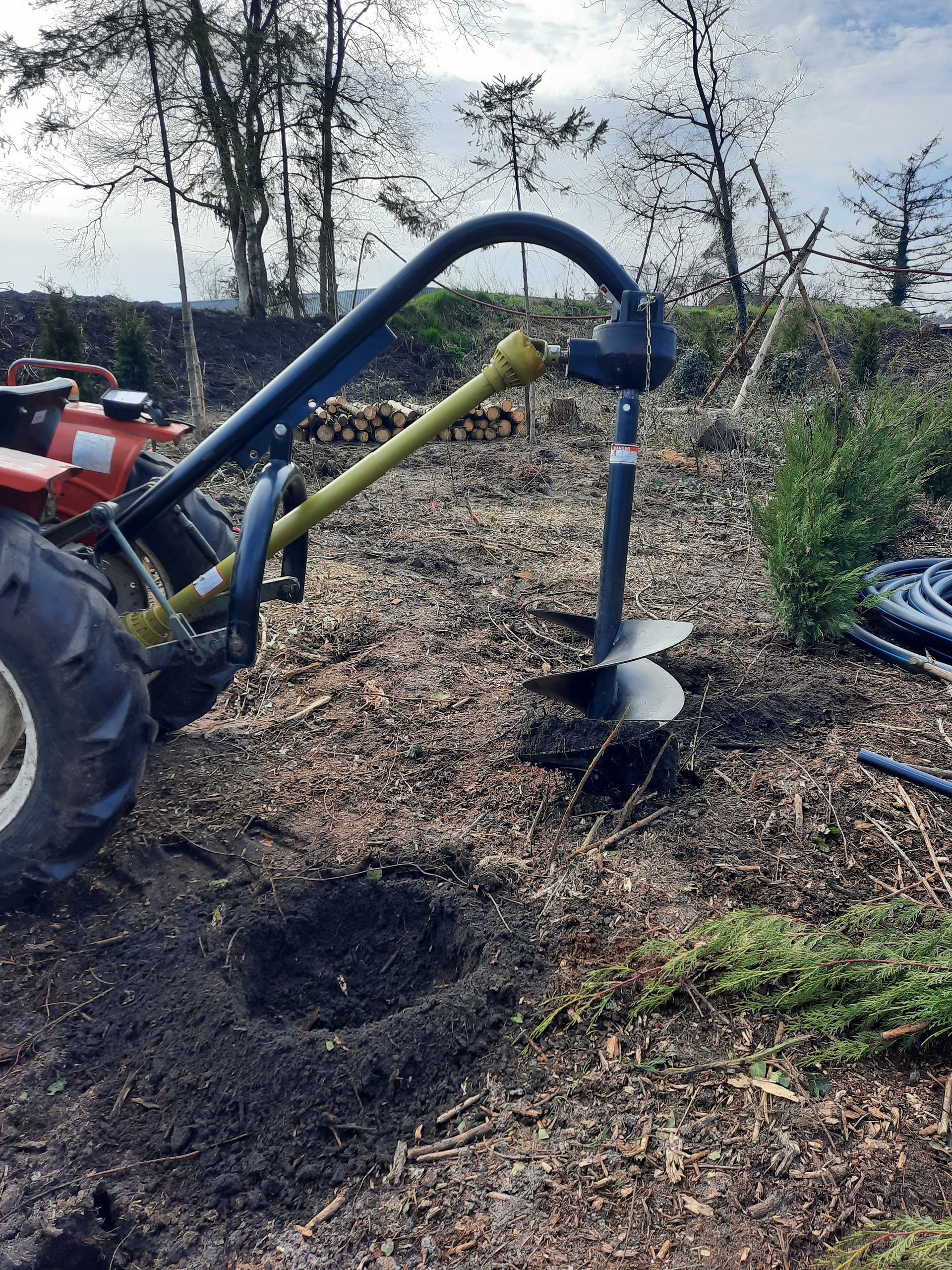 Ook ben ik begonnen met aanplanten van de wal en de vrijgemaakte grond. Er zijn 200 coniferen aangekocht voor de buitenrand van het perceel. Hiervoor hebben we een hele serieuze grondboor aangeschaft die achterop de trekker bevestigd wordt en door de aandrijfas gaat draaien.