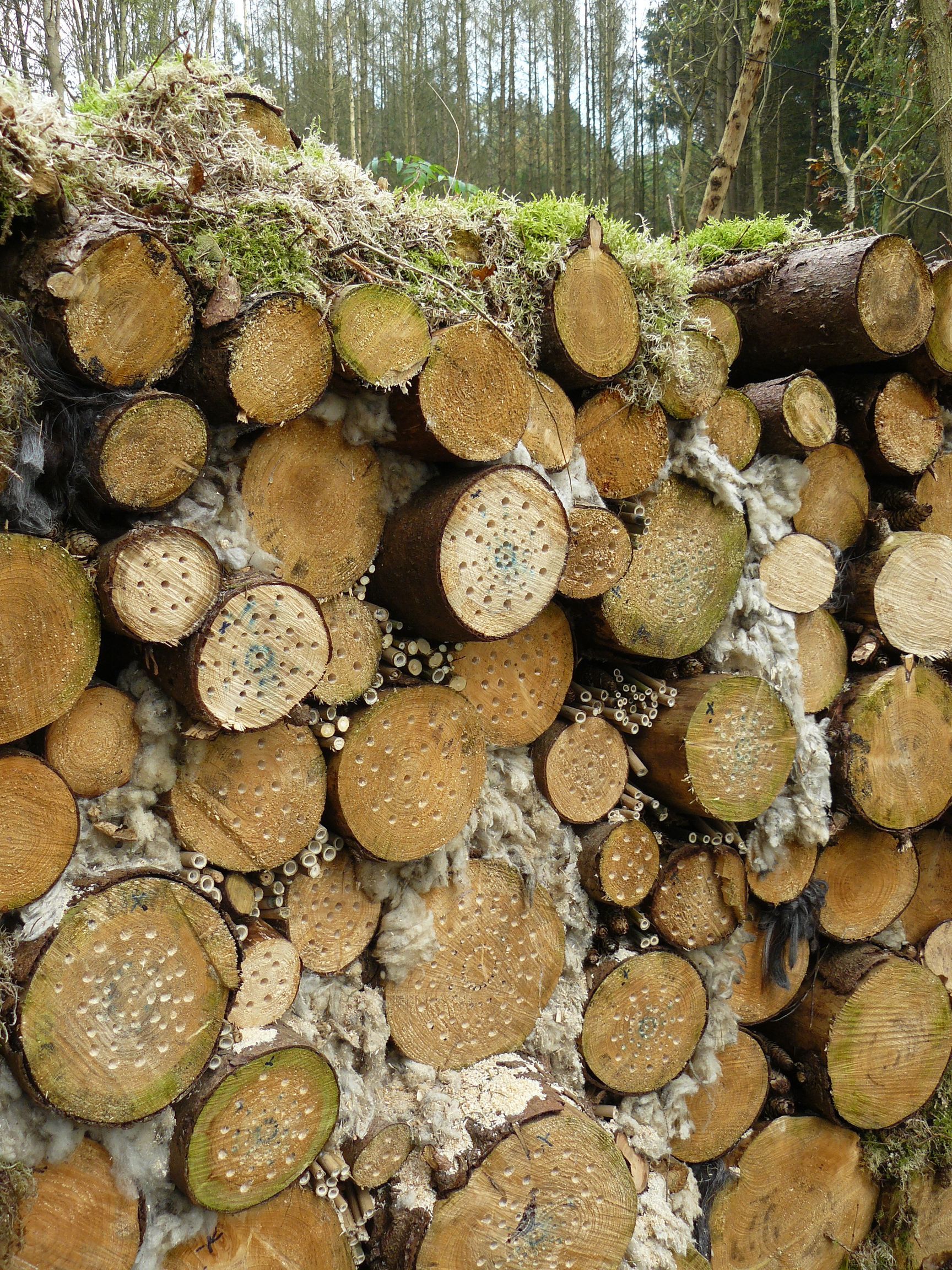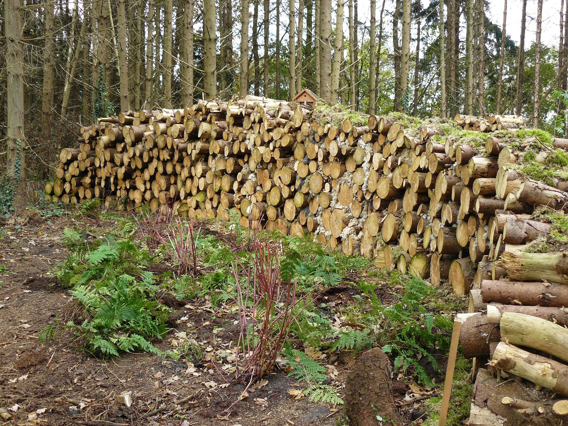 De boomstammen die niet meer te verzagen zijn tot planken zijn ingekort in stukken van 1 meter en opgestapeld tot insectenhotels. Daar tussendoor slingert een pad evenwijdig aan de lange wal. Dit wordt niet zomaar een pad, het wordt een Keltische Boomkalender-pad. Iets waar ik me al een hele tijd op heb zitten verheugen om mee te beginnen.
