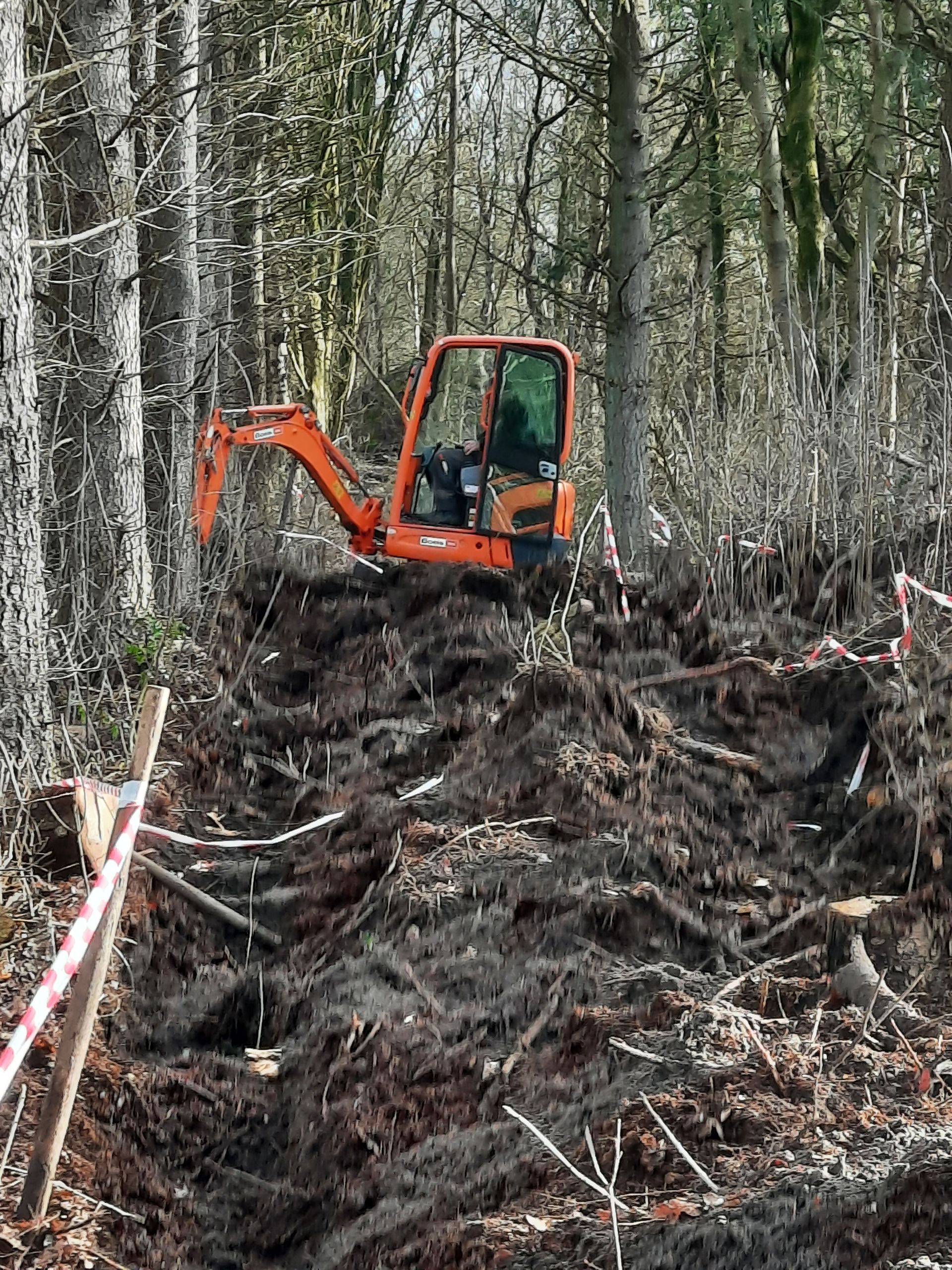 Het minikraantje heeft de dikke laag wortels doorploegd voor een rechte diepe geul, heerlijk als je het zware werk kan uitbesteden aan iemand met een machine. De grond uit de geul werd middenin gelegd waardoor het leek of er een enorme prehistorische mol had huisgehouden. Daarna kwamen de, kleinere, wilgjes op 20 cm afstand van elkaar in de geul. Het kraantje kwam er weer achteraan om de megamolshopen te egaliseren.