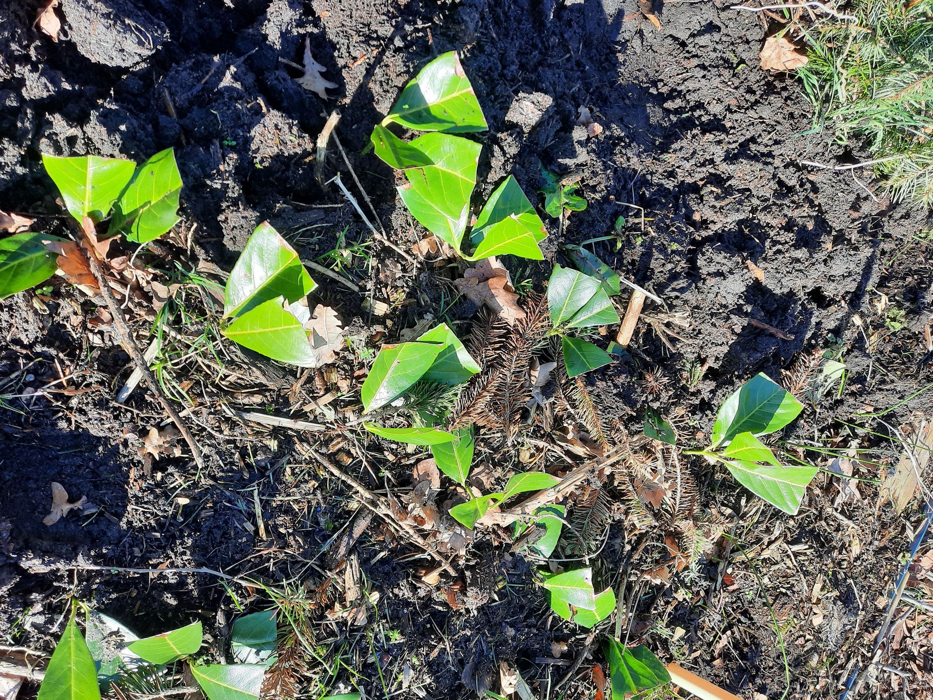 Doordat we met een minikraantje gewerkt hebben is de grond in de geul mooi los en luchtig. Na het planten is er paardenmest van Mahndoo (goed zo ventje!) bij gekomen. Daarna heb ik de toplaag van de bosgrond die nog op de parkeerplaats lag bij elkaar geharkt, dit is prachtig spul wat als mulchlaag over de voetjes van de jonge beukjes is gegaan. Als het droger, warmer weer wordt zal dit helpen de beukenjonkies te beschermen tegen uitdrogen. We hadden nog 2 tonnen met beukenaarde staan die inmiddels vol geregend waren. In die aarde zitten de bacteriën en schimmels die de verhuisde beuk helpt een zo optimaal mogelijk bodemmilieu te krijgen op zijn nieuwe woonplek. De grond in de tonnen leek meer op drijfmest, met bijpassende geur, maar ik heb het alsnog over de wortels gegoten.